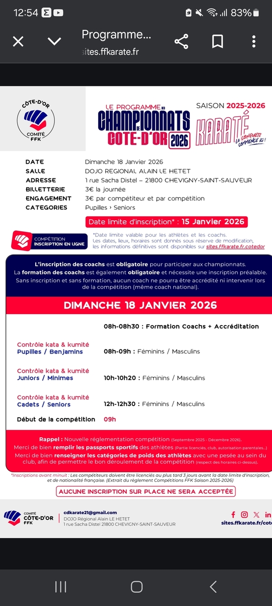 Le programme des chpts de Côte d'or est sorti. Ne pas oublier pour les participants de signer l'autorisation parentale pour saison 2025-2026 sur le passeport sportif et la carte d'identité ou photocopie.